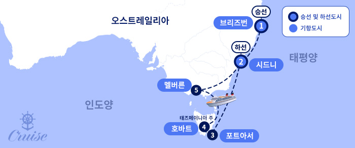 인천 - 브리즈번 승선 ▶시드니 ▶ 포트아서 ▶ 호바트 ▶ 멜버른 ▶ 시드니[호주] 하선 - 인천